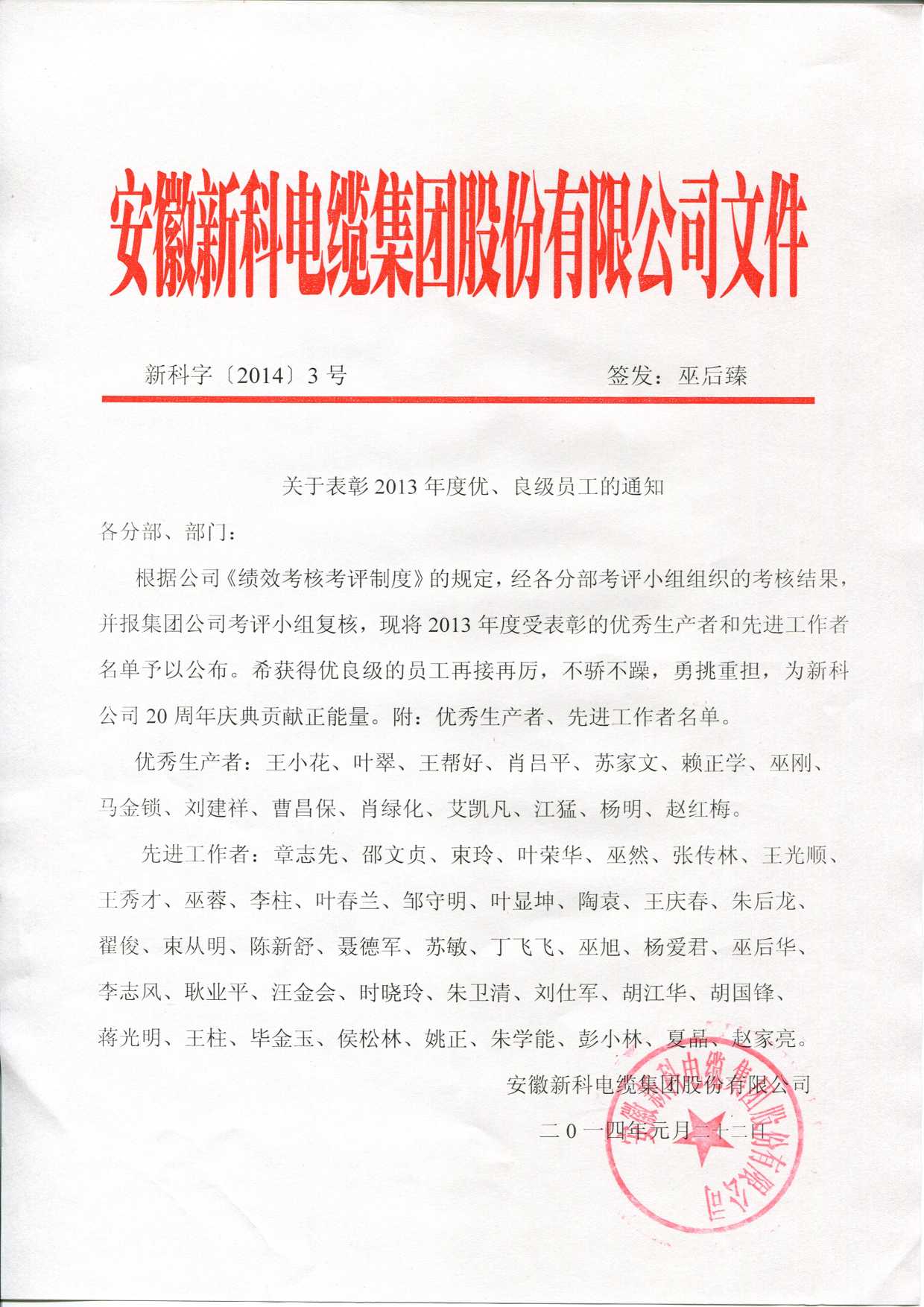 關(guān)于表彰2013年度優(yōu)、良級員工的通知